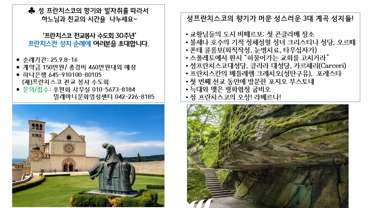 ![]() "ÇÁ¶õÄ¡½ºÄÚ Àü±³ºÀ»ç ¼öµµÈ¸ 30ÁÖ³â" "ÇÁ¶õÄ¡½ºÄ ¼ºÁö ¼ø·Ê"¿¡ ¿©·¯ºÐÀ» ÃÊ´ëÇÕ´Ï´Ù. ¼ø·Ê±â°£ : 2025.09.09 ~ 2025.09.16 °è¾à±Ý : 150¸¸ / ÃѰæºñ 460¸¸¿ø³»¿Ü ¿¹»ó ÇϳªÀºÇà : 645-910100-80105 (Àç)ÇÁ¶õÄ¡½ºÄÚÀü±³ºÀ»ç¼öµµÈ¸ ¹®ÀÇ/Á¢¼ö : ÈÄ¿øÈ¸ »ç¹«½Ç : 010-5673-8184 ¹Ð·¹¸¶´Ï¹®È¿µ¼º¼¾ÅÍ : 042-226-8185 ¼º ÇÁ¶õÄ¡½ºÄÚÀÇ Çâ±â¿Í ¹ßÀÚÃ븦 µû¶ó¼ ÇÏ´À´Ô°ú Ä£±³ÀÇ ½Ã°£À» ³ª´©¼¼¿ä |